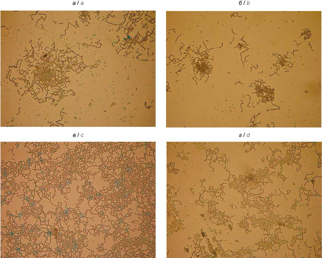 Рис. 2. Микрофотография цепочек и готовой сформированной биоплёнки S. pyogenes 30М под воздействием низких доз АБП.а — оксациллин, 0,5 мг; б — оксациллин, 1,0 мг; в — цефазолин, 0,5 мг; г — цефазолин, 1,0 мг. Окраска альциановым синим, × 400.