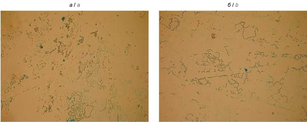Fig. 2. Chains and biofilm of S. pyogenes type 30M under the influence of the low doses of antibiotics. a — oxacillin, 0.5 mg; b — oxacillin, 1.0 mg; c — cefazolin, 0.5 mg; d — cefazolin, 1.0 mg. Stained with Alcian Blue, × 400.Рис. 3. Микрофотография цепочек и сформированной биоплёнки S. pyogenes 30М под воздействием высоких доз АБП.а — оксациллин, 2,0 мг; б — цефазолин, 4,0 мг. Окраска альциановым синим, × 400.