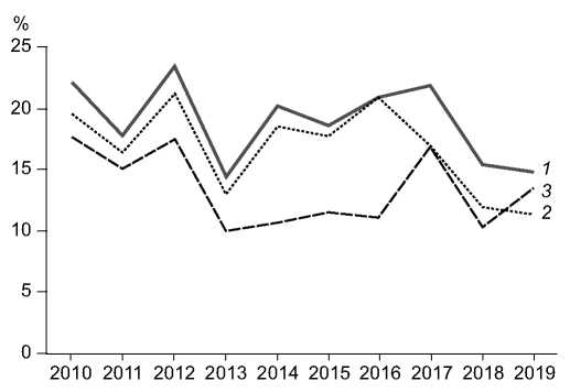 Y-axis: the percentage of patients who are sensitized to house dust mites from the total number of patients with IgE-mediated allergic diseases. 1 — sensitization to house dust mites (Der. p. and/or Der. f.); 2 — sensitization to Der. p.; 3 — sensitization to Der. f.