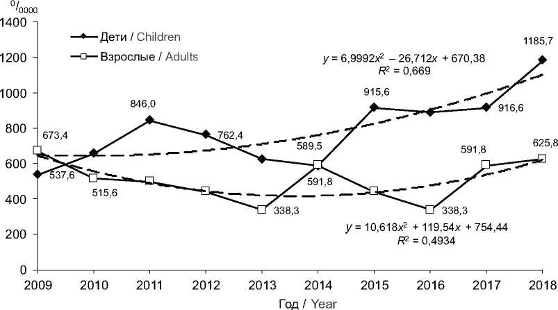 The Sverdlovsk Region ranks among the regions with the highest prevalence of HIV + TB coinfection [4]. Based on the data from report form No. 61 "Information about HIV-Infected Population", the prevalence of coinfection was 22.1 per 100,000 population in the region in 2018 and was 2.7 times higher than the average level in the country (8.50/0000). In 2004–2018, 84 cases of TB disease were recorded among the HIV-infected children. Based on the report "Data on People with Tuberculosis Disease" (Form No. 33), in 2009–2018, the incidence among the children having household contacts with active TB cases showed an upward trend with average annual growth rate of 6% and was 1.9 times higher than the incidence among adults having the similar exposure (Figure).